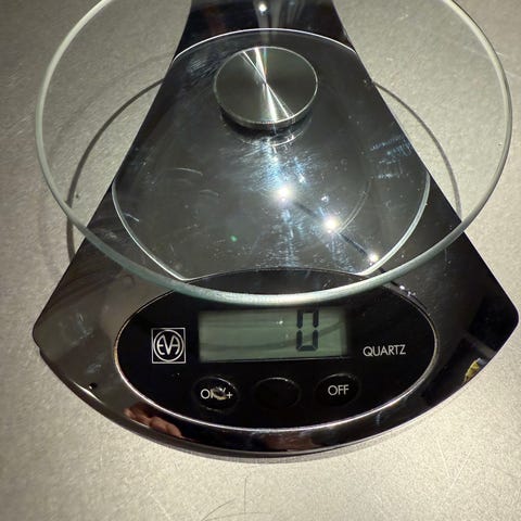 Eva Solo køkkenvægt med skål i beige farve. Vægten har en rund skive med tydelige måleenheder og en skål til opmåling af ingredienser. Designet inkluderer en metalholder til skålen. Velegnet til præcis vejning af madvarer i køkkenet.