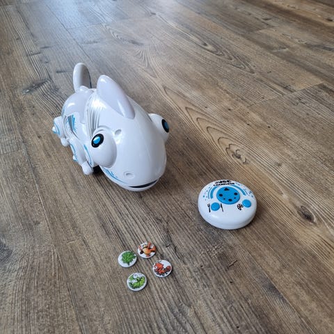 Stor sej bil med lys, lyde og vanddamp ud af munden. Med fleksible hjul så den kan drifte sidelæns og i forskellige retninger og spinne 360 grader. Inkl. USB-kabel og 3,7V genopladeligt batteri til bilen. Nypris 499,-