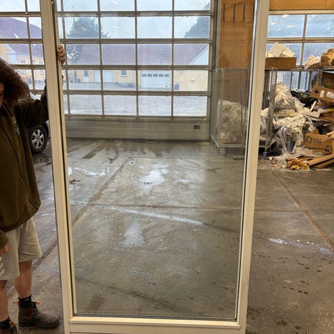 Farvet glasvindue med grå karm