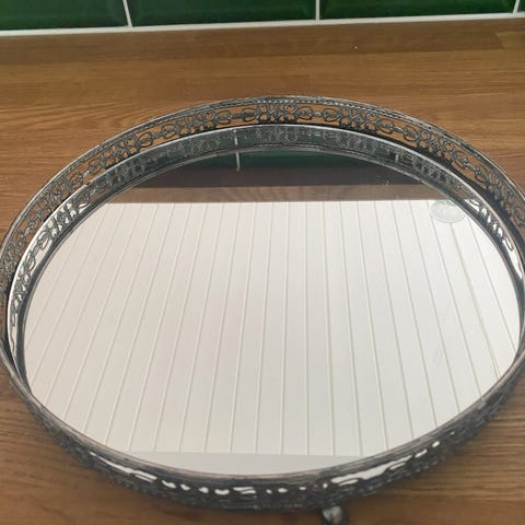 Rundt spejl bakke med metalramme i vintage stil. Bakken har en spejloverflade og en dekorativ, udskåret metalramme. Den er udstyret med små fødder for stabilitet. Velegnet til opbevaring eller dekoration i hjemmet.