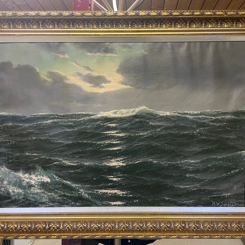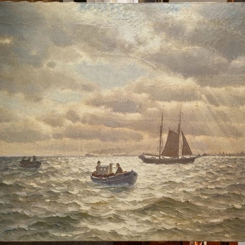 C.F. Sørensen marine maleri med motiv af både og havlandskab. Maleriet viser bølger, både på stranden og i vandet, samt en gruppe mennesker ved kysten. Udstillet i perioden 1. juni til 8. september 1991. Farverne domineres af blå, grå og brune nuancer.