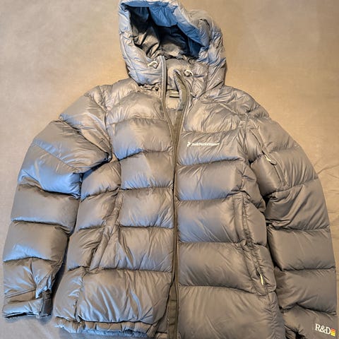 Peak Performance Vinterjakke i størrelse L til kvinder. Jakken er grå og lavet af dun, hvilket giver isolering og varme. Designet til vinterbrug med fuld lynlås og hætte.