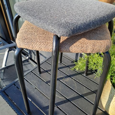 2 taburetter, stel i jern, sæde af 4 trælameller.