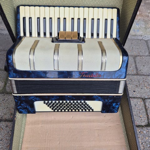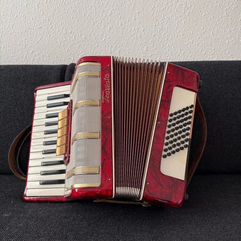 Spiller fint, tydeligvis brugt. Har overtaget den efter et dødsbo, ved ikke meget om den. En tangent "stritter" lidt, men spiller. Tidligere ejer var kompetent harmonika-mand, havde en del instrumenter, alle god kvalitet. Kasse medfølger.