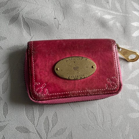 Mulberry læder pung til kvinder i sort farve. En Pungen har flere rum til kort og mønter, herunder et lynlåslomme og en knaplukning. Indersiden har et mønstret stofmateriale.
