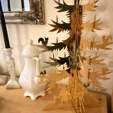 Stort amerikansk Evergleam aluminiums juletræ på ca. 2 m. Stammen er af træ og kan eventuelt afkortes, hvis man ønsker det. Træet er nemt at montere og fylder ikke meget når det er pakket sammen. Tænker det er fra omkring 1940/50 og står i original emballagen.