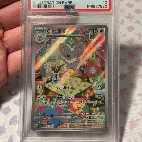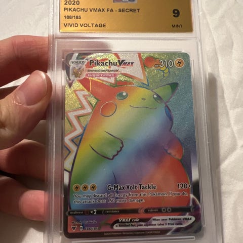 2021 Brilliant Stars Acerola's Mimikyu Vmax PSA 9 350kr, og PSA 10 900kr. Alle mine priser i er taget fra pricecharting, som der dækker det amerikanske marked på enkeltkort udenfor EU. De er lagt på, eller under gennemsnittet af prisen på de solgte (average) og hvor du spare kattepinen med told, hvis det nu skulle være et lidt mere specielt kort du har i tankerne jeg har på løbene. Jeg sender ud med GLS, når det gælder PSA slabs, da man kan føle sig mest tryg der efter min mening. Mvh Dennis
