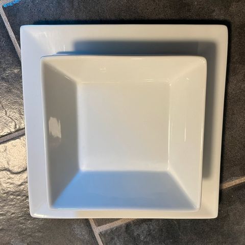 Tallerken, Firkantet tallerken med design af sten eller dekorationstallerken.