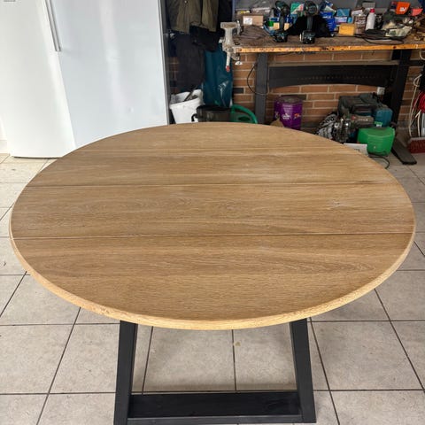 Rundt egetræsbord. Kan trækkes ud fra midten hvor 1 eller 2 plader kan sættes i - fuld længde med begge plader er 220 cm - tillægs plader er i finer og bord og ben i rent træ