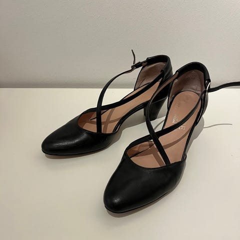 Sorte støvletter med indbygget plateau og lynlås i hælen. Støvlerne har flere læg og stropper i siderne og en tynd stilethæl. Læder over alt + lille gummisål foran. Næsten som nye, men trænger til nye såler på hælene. Hælhøjde 12 cm, plateau foran ca. 2,5 cm, indvendig længde ca. 26 cm.