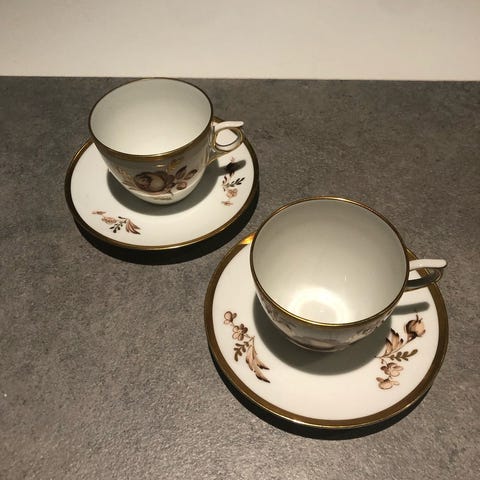 Brun Rose kaffekopper med underkop og kagetallerken. I meget fin stand. 1 sæt koster 79 kr. Flere sæt kan tikøbes. Samt flere fade. Kander. Mm.