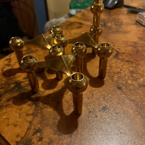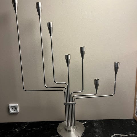 Smuk og velholdt lysestage i stål. Højde 60 cm uden lys, bredde min. 30 cm, alt efter hvordan den foldes ud.