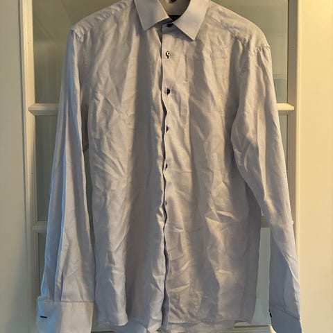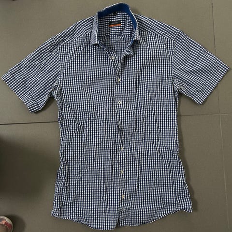 skjorte i blå farve, størrelse L til herre. Slim fit Fremstillet i bomuld. Kortærmet design med ternet mønster.