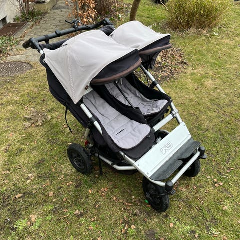 Mountain Buggy Duet tvillingeklapsvogn i sort farve. Vognen har robuste hjul egnet til forskellige terræner. Den har justerbare sæder, sikkerhedsseler og en sammenklappelig ramme for nem transport og opbevaring.