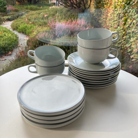 Service i fajance fra serien Blåkant designet af Grethe Meyer og produceret hos Royal Copenhagen og Aluminia. Fremstår i pæn stand.