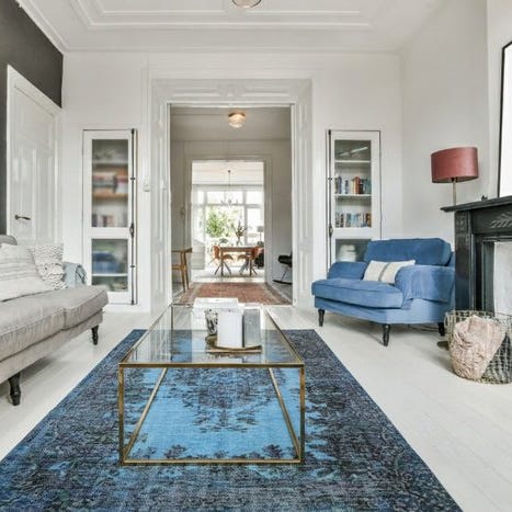 Vintage håndvævet tæppe i dushede blå og røde farver