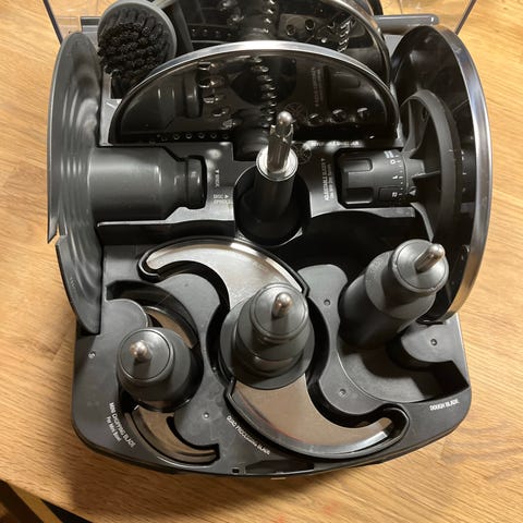 Sage Kitchen Wizz Pro køkkenmaskine med flere tilbehør til forskellige køkkenopgaver. Maskinen har en gennemsigtig beholder, flere knive og tilbehør til hakning, skæring og rivning. Udstyret med knapper til justering af hastighed og funktioner. Maskinen er designet til hjemmebrug og kan håndtere en række madlavningsbehov.
