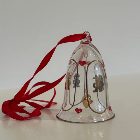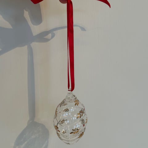 Bing & Grøndahl Golden Christmas julepynt for Holmegaard. Årets glaskogle 2005 med dekorationer af gyldne blade og rød snor til ophæng.