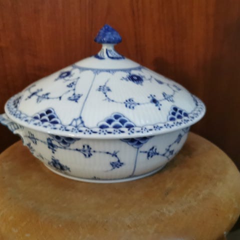 Smuk gammel musselmalet terrin, dia 24 cm meget velholdt, står fuldstændig som ny, ingen fejl over hovedet, ny pris ca kr 11.400 sælges til en uhørt lav pris, bør ses