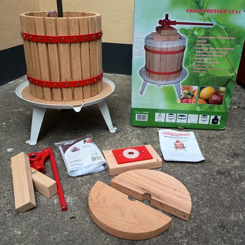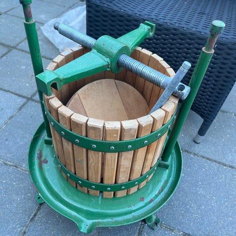 Æble presser I god kvalitet sælges, opsanlingsbakken og stavene er af avnbøg og håndtaget i fyrtræ. Kraftig og tung æblepresser som kan boltes fast i hjørnerne ved behov. Indvendig diameter er 310mm og højden er 350mm. Tårnet kan tiltes bagud ved tømning så lamel ringen kan tages ud for tømning af pulp efter presning. Der er monteret smørrenippel for smøring af gevind spindlen.