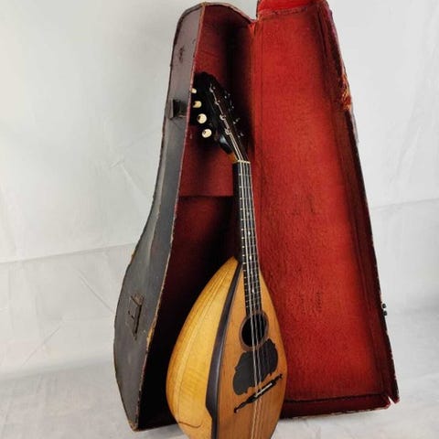 Sinfonia Rundbundet Mandolin Håndbygget i DDR Tyskland. Smuk udskåret roset og hoved. Reparation 2 stk revner i lamellerne i bunden, revne i stol, 1 stk. mekanik knup mangler, se fotos, Sælges fra min historiske strenge instrument samling. I prisen er der taget højde for reparations omkostningen, Hvis mandolinen skal bruges til DEKORATIVt formål er en reparation unødvendig. Mandolinen leveres med 1 sæt Nye strenge.