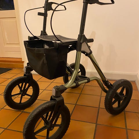 Trionic Veloped Off-road rollator, fint brugt. Meget stabil og god til både skov, strand og by. Kan klappes sammen så den fylder rigtig lidt. En bremse på højre hånd, som bremser begge hjul. Rigtig god til et friluftsmenneske.