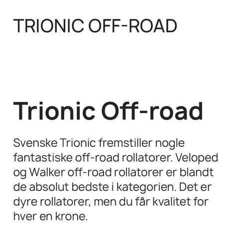 Trionic Veloped Off-road 12" rollator, fint brugt. Meget stabil og god til både skov, strand og by. Kan klappes sammen så den fylder minimalt. En bremse på højre hånd, som bremser begge hjul. Rigtig god.