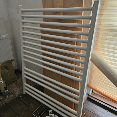 Hvid håndklædetørrer radiator med buede tværstænger, designet til opvarmning og tørring af håndklæder.