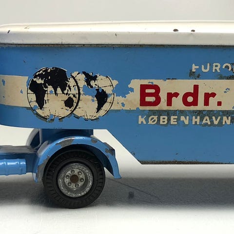 Tekno Volvo FB88 i blå/gul med reklamer for ASG Transport - Spedition, lastbilen Tekno Denmark, anhængeren er Tekno Holland, tagskilt følger med i pose