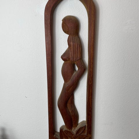 Leo Hansen træskulptur med udskåret menneskefigurer og blomster.