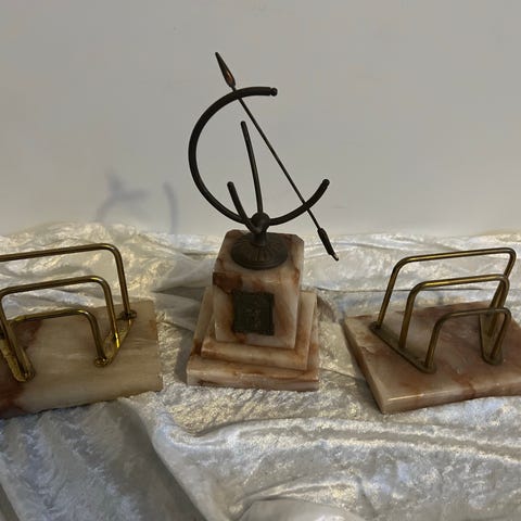 Andre samleobjekter, Solure, 3 solure messing på marmor. 2 med skilt "Gør som jeg tæl kun de lyse timer" 17 og 13 cm høj. 1 med kalender 22 cm lang. kr 300,-/stk, alle 3 kr 750,-