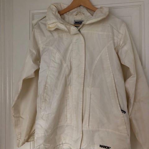 Jakke, str. 38, Nanok, Næsten som ny, Dame jakke med hætte, lys sælges for 100 kr.