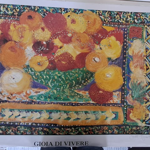 Litografisk tryk, Charlotte Thymark , motiv: Blomster, b: 100 h: 70, Flot stor plakat i glade farver.
