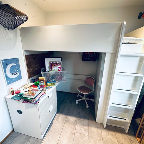 IKEA MYDAL køjeseng med integreret skrivebord og stige i hvid. Designet til børn og unge med pladsbesparende funktion. Kun få år gammel.