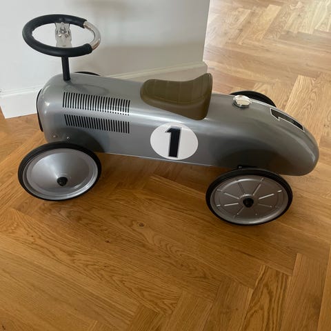 Sej racerbil i metal til de små. Bilen har et gennemført, klassisk design med gummihjul, kølergrill og sæde i læderlook og sidst men ikke mindst, fælge i metalfarve.