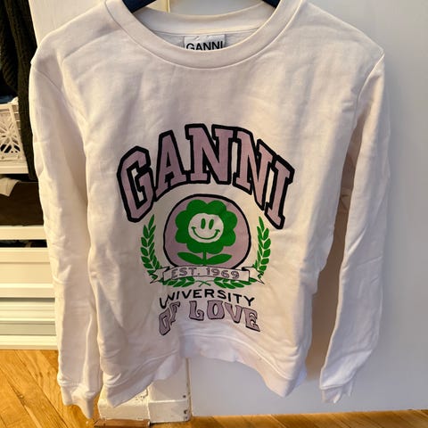 Sweatshirt fra Ganni i lyserød med sorte striber. Str. L men svarer til M. Den er i fin stand og fra ikke-ryger hjem. Kan leveres i Skive ved lejlighed og sender gerne.