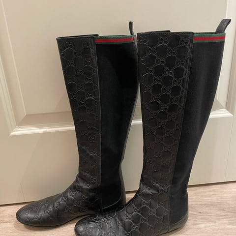 Chanel Gummistøvler i størrelse 40. Støvlerne er hvide med dekorative blomsterdetaljer i sort og beige. Materialet er gummi, velegnet til vådt vejr.