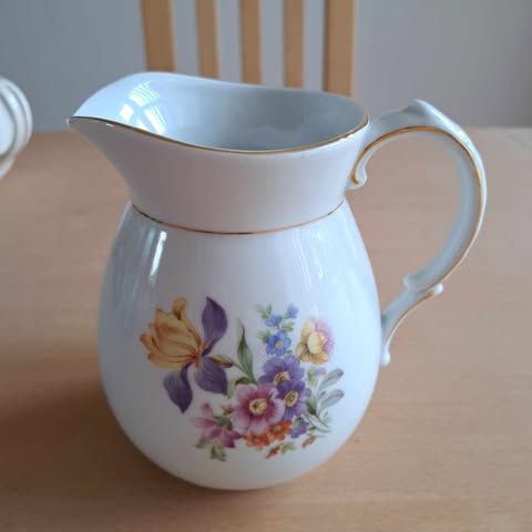 Kande pyntet med guld, Porcelæn, 60 år gl., Flot gl kande der tidligere har været brugt til servering af kaffe og varm kakao. Kan også bruges til vase mulighederne er mange afhentningspris