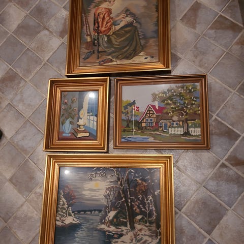 Broderibilleder i rammer, Håndlavet, To stk. flotte broderibilleder i smukke rammer.