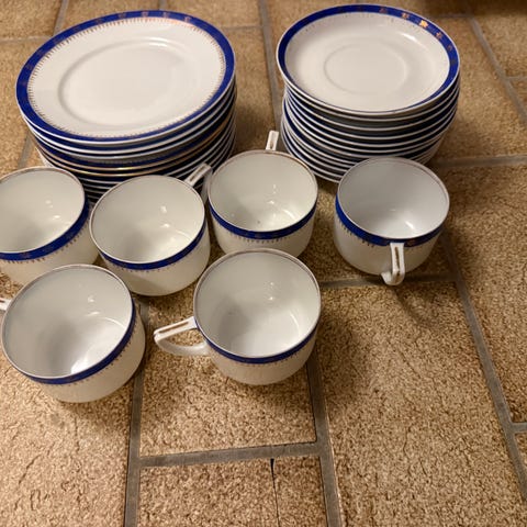 Form: Klassiske kaffekopper med håndtag, passende underkopper og kagetallerkener