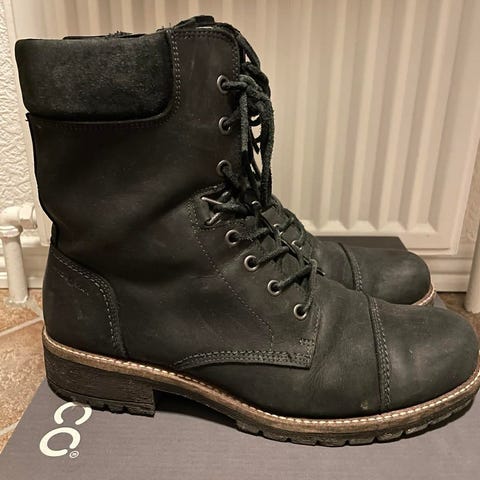 ECCO støvler i størrelse 37. Støvlerne er sorte og har snørelukning samt lynlås på siden for nem adgang. Fremstillet i læder med gummisål. Velegnet til daglig brug