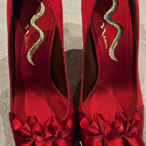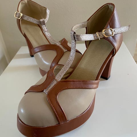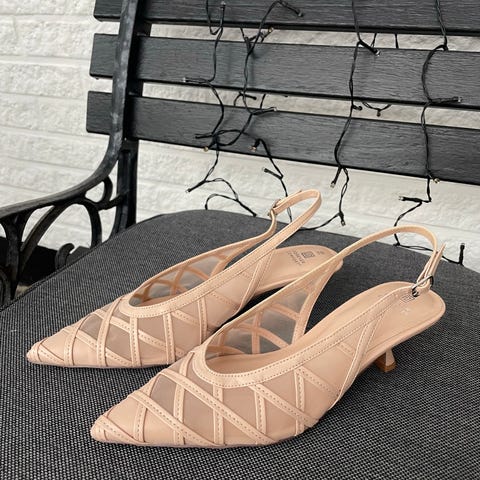 Nokian højhælet sko i størrelse 40. Skoene har en spids form og en åben hæl med strop. Farven fremstår som metallic, og materialet er ikke specificeret. Designet er til kvinder.