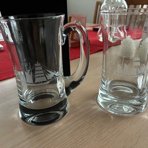 Per Lütkens ølkrus Ølhunden, håndlavet i blågrå røgfarvet tykt glas hos Holmegaard.