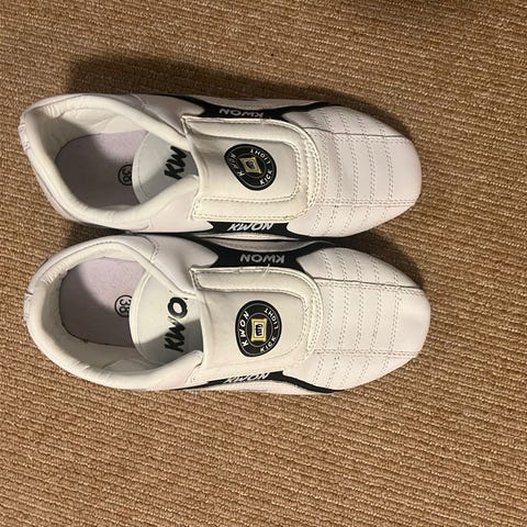 T1 Kampsport karate Sko i størrelse 39, farvet hvid og sort. Designet til kampsport med slidstærk sål og polstret overdel for komfort og beskyttelse under træning og konkurrence.