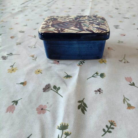 krukke med låg højde ca 6 cm dia ved låg ca 6 cm - krukken er gylden inden i - den er grøn med blomster ligner noget metalfarve - købt i USA i 1993 - slettes når varen er solgt