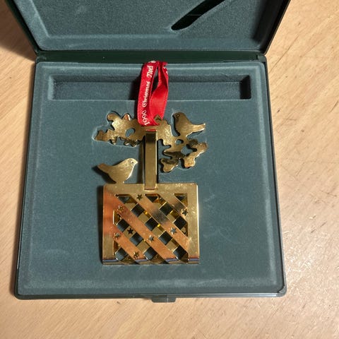 Georg Jensen Christmas Pig 2003 julepynt i guldfarvet metal. Dekoration til jul, designet som en gris med bånd. Fremstillet i Danmark.