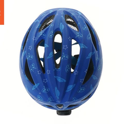 Lazer børnehjelm med rumtema i blå farve med illustrationer af planeter, raketter og astronauter. Hjelmen har ventilationsåbninger og indvendig polstring for komfort og beskyttelse.