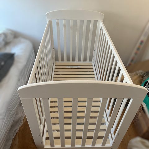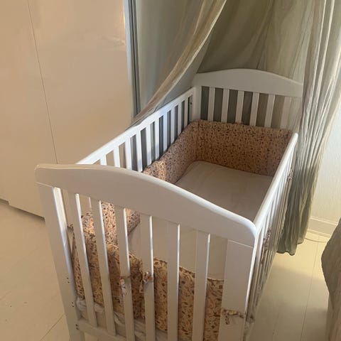 JLY Tremmeseng til børn med tremmesider, designet til at give sikkerhed og komfort. Sengen er egnet til små børn og har en neutral hvid farve.