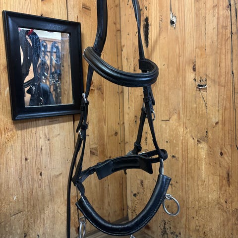 Sort læder kapsun str. cob i meget god stand. Minder om Deuber-kapsun (Klaus Schöneich). Ligger stabilt på hestens hoved og glider ikke rundt. Flere muligheder for tilpasning og mange justerbare remme, som gør det muligt at justere ift. hesten. Kan også passe en full. Med messingspænder. Meget blødt, polstret næsestykke.