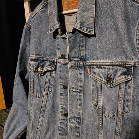Levi's Jakke i denimmateriale i blå farve. Jakken er i størrelse XL og designet til mænd. Den har klassiske detaljer som knapper foran og brystlommer.Jakken er som ny, er kun brugt få gange.